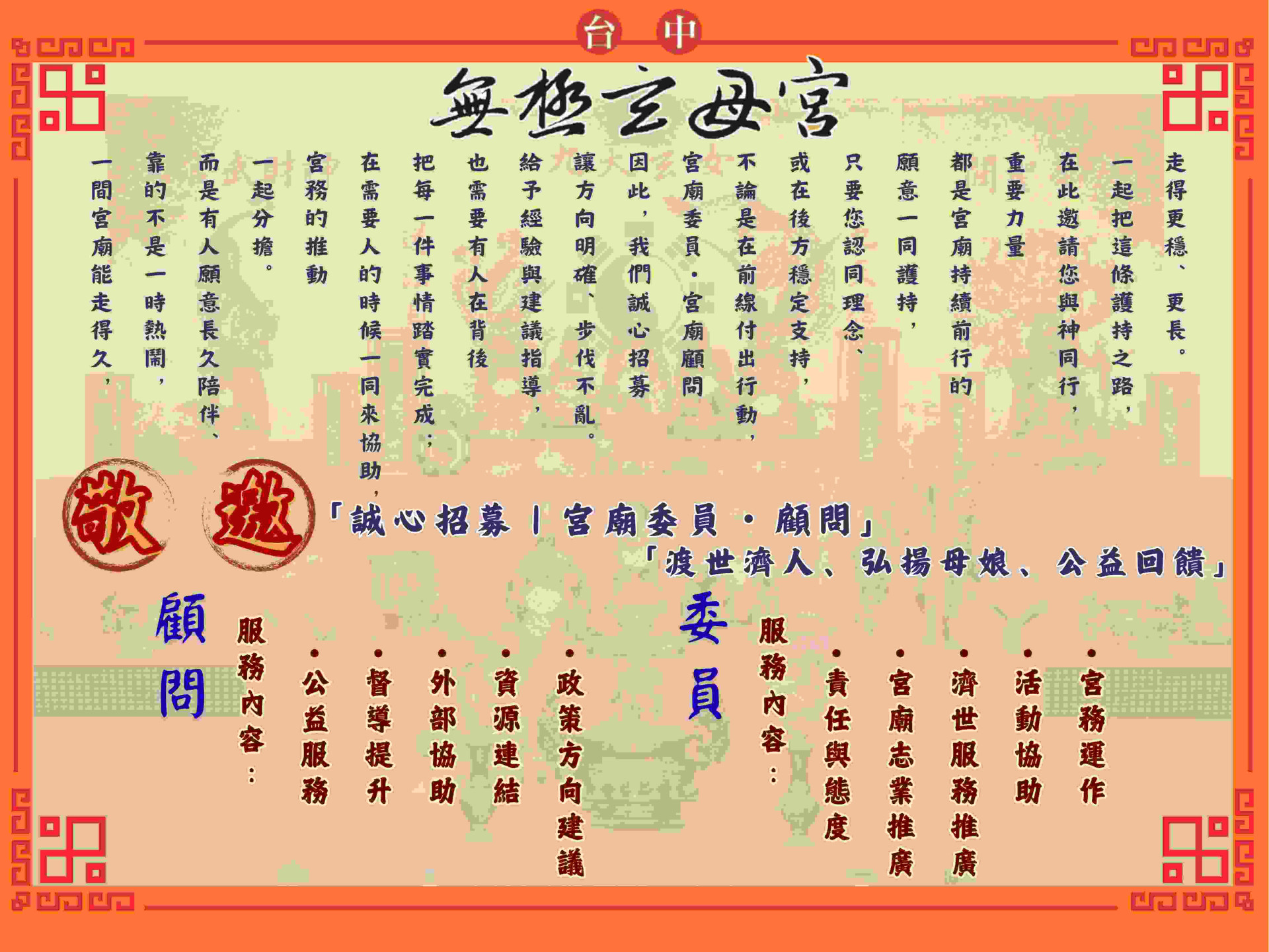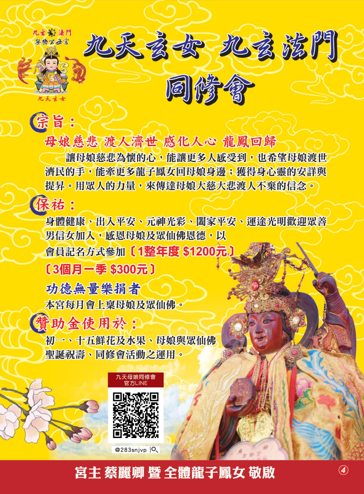 最新消息 近期活動 國曆4/19(日) #真武大帝(玄天上帝) #聖誕千秋🎊 2026.04.14 國曆4/19(日) 農曆3/3為 #真武大帝(玄天上帝) #聖誕千秋🎊 上帝公威靈顯赫,足踏龜蛇、手持寶劍,蕩魔鎮煞, 更是守護事業與財運的重要家神與守護神! 近期活動 誠心招募 宮廟委員 顧問 2026.04.14 我們需要的, 不是更多人, 而是對的位置,遇到對的人。 如果你願意走近一點, 用你的方式參與其中, 那麼,我們誠摯邀請你 近期活動 九天玄女娘娘聖誕千秋 祝壽慶典 2026.03.30 在此邀請大家一同來參加今年的聖誕,一起來祝壽、沾喜氣! 備有平安齋與大家結緣,吃平安、補福氣。 大家趕快把這天在行事曆上畫大紅圈,帶著家人一起回宮聚聚吧! 近期活動 捐血活動 2026.03.11 台中血袋庫存不足,一起努力讓台中血袋庫存在綠燈安全水位❤️❤️❤️ 捐血一袋救人一命!!💞💞💞 我們非常需要大家的大力支持,一起達標!💪 活動花絮 #愛心物資 #社會公益 #溫暖傳遞 #蓄勢待發 2026.02.09 【歲末愛心・溫暖同行】 在歲末之際,我們希望把關懷送到每一個需要的家庭。 透過物資發放,陪伴中低收入戶、低收入戶及身心障礙朋友, 一起迎接更安心的新一年。 活動花絮 2025年 台中無極玄母宮 南巡晉香 2025.10.31 11/2(日)我們將前往: 🔱 #高雄三鳳宮, #中壇元帥 🍶 #嘉義龍隱寺, #濟公活佛 活動花絮 2022年圓科晉香 2022.10.30 2022年三載圓香 尋根,團結,回饋 活動花絮 2022年普渡法會 2022.08.21 2022年中元普渡法會 影片觀賞 媒體採訪-東森新聞專訪 2022.04.26 東森財經新新聞台,台灣大代誌的採訪,讓更多人知道九天玄女娘娘及台中無極玄母宮的起源。 活動花絮 2022年九天玄女娘娘聖誕 2022.03.17 2022年台中無極玄母宮 主神九天玄女娘娘聖誕千秋 聖誕盛會 瞭解更多消息 服務項目 ✴️ 母娘同修會・光明燈祈福 ✴️ 我要預約 太歲燈 我要預約 發財金 我要預約 補財庫 我要預約 瞭解更多 關於玄母宮 母娘慈悲渡人濟世感化人心龍鳳回歸讓母娘慈悲為懷的心,能讓更多人感受到,也希望母娘渡世洲民的手,能牽更多龍子鳳女回母娘身邊:獲得身心靈的安詳與提昇,用眾人的力量,来傳達母娘大慈大悲護人不棄的信念。 玄母宮介紹 團隊介紹 宮主蔡麗卿 主辦老師黃寅升 顧問呂素珠 總執事沈俊奕 瞭解更多 紀錄片 開運商品 個人八字命盤 個人紫微斗數排盤 奇門盾甲 九天玄女奇門盾甲 取名,公司名 神之命理-命名模式 開運手鍊系列 - 客製化 三排水晶手鍊 開運首飾系列 開運手環一號 更多開運商品